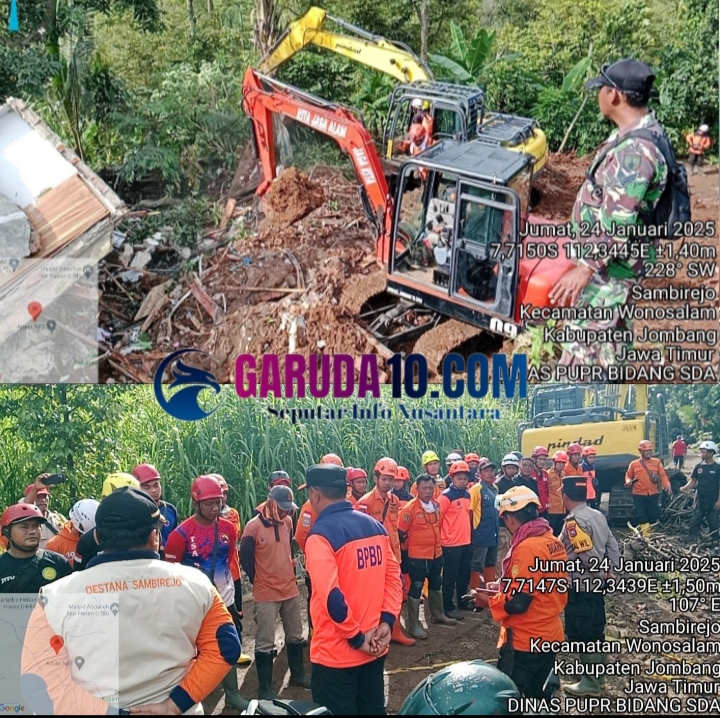 Jombang, Garuda10.com – Gerak Cepat Dinas PUPR tangani Bencana tanah longsor yang terjadi di Desa Sambirejo Kecamatan Wonosalam, pada Kamis pagi (23/01/2025). Selain menelan korban jiwa dan luka berat akibat longsoran tanah dari tebing pegunungan Anjasmoro. Terlihat banyak beraneka sampah berupa material longsor, Mulai dari bangunan rumah, cor semen, kayu, dan aneka pepohonan yang menimbun rumah warga.