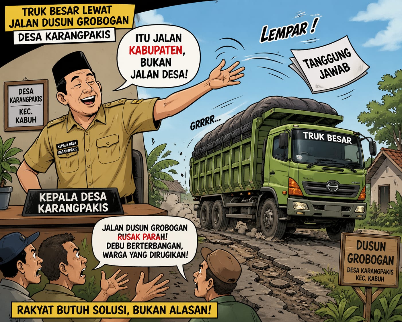 Warga menilai Pemerintah Desa Karangpakis tidak tegas dan terkesan membiarkan pelanggaran terus terjadi. Padahal truk tersebut diduga bermuatan berat dan berpotensi merusak jalan serta jembatan yang selama ini digunakan warga.