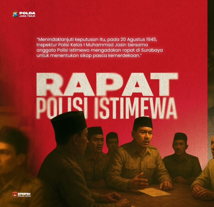 Mojokerto, Garuda10.com – Pada tanggal 21 Agustus 1945, sebuah momen bersejarah bagi Kepolisian Republik Indonesia muncul di Surabaya. Pada hari setelah pertemuan untuk menentukan sikap, Inspektur Polisi Kelas I Muhammad Jasin memimpin Proklamasi Polisi, sebuah pernyataan komitmen kepada Republik Indonesia yang baru saja meraih kemerdekaan.